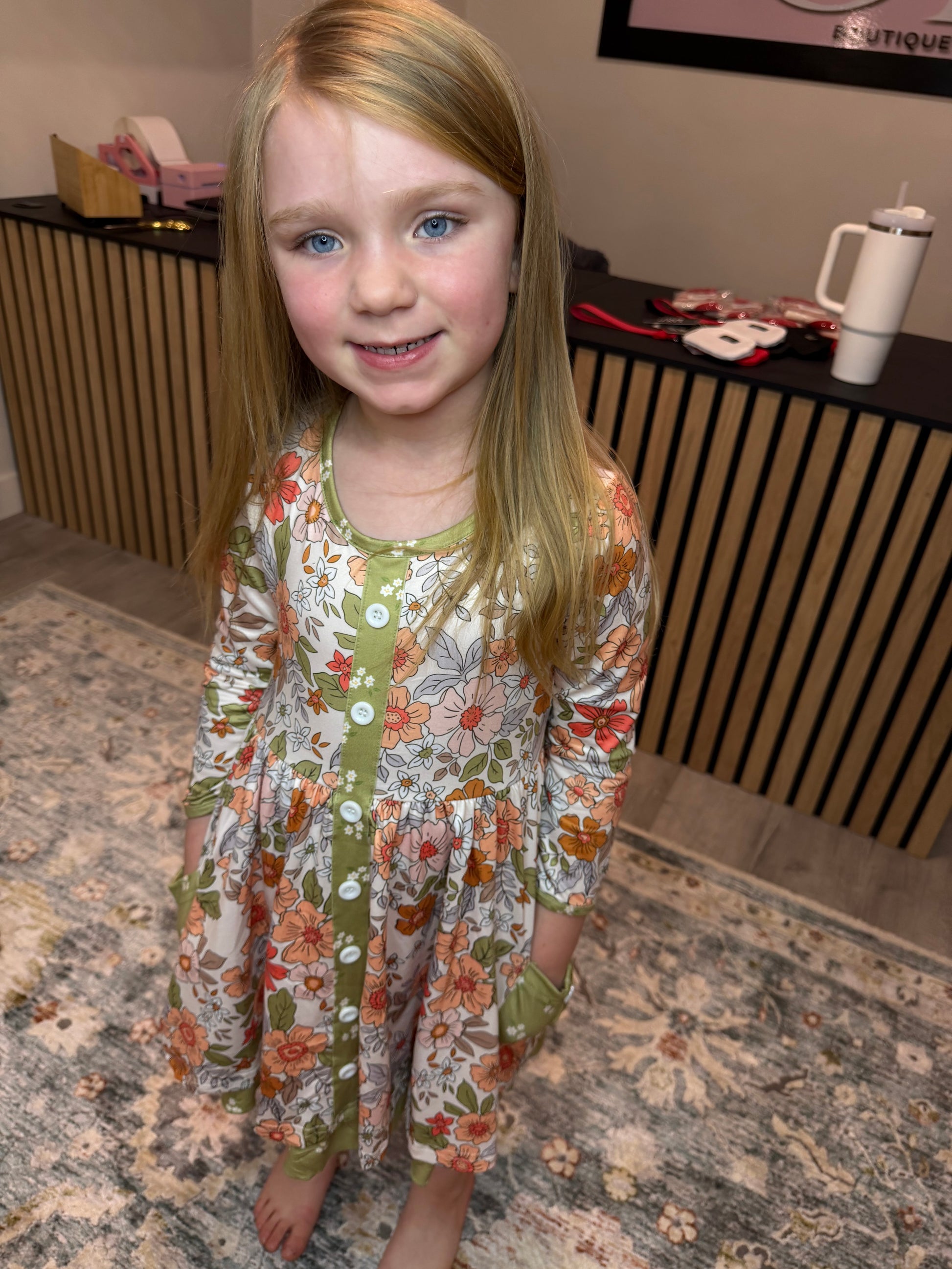 Kids Sage & Rust Fall Floral Button Dress with Pockets
